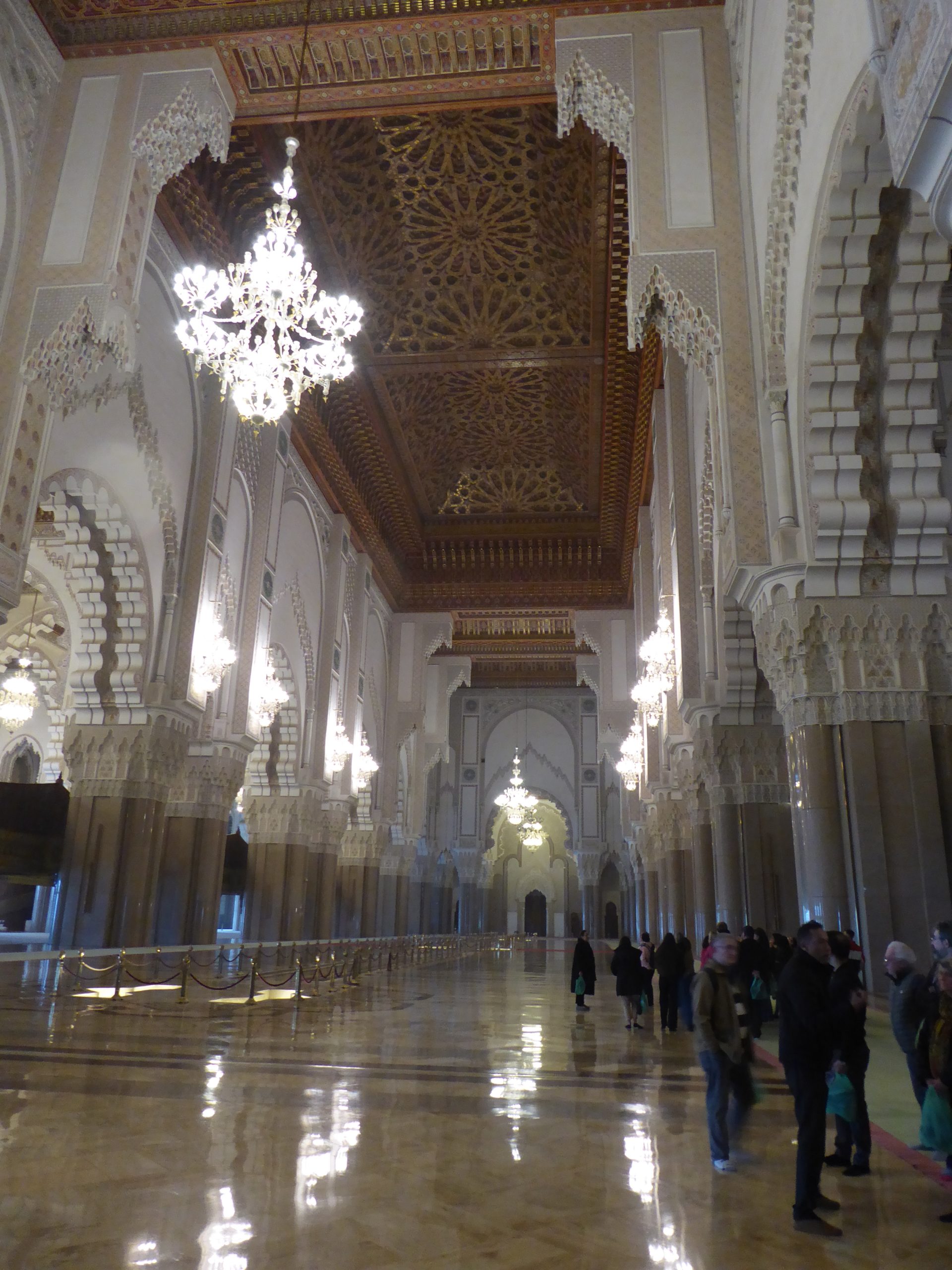 As we arrived in Casablanca a day early, our taxi driver convinced us to take a tour of the city with him the next day. This allowed us a view of the wealthy area of the city along the Atlantic coast, an up-scale mall with its voluminous fish tank, the city’s massive new mosque and a brief time in the souk (market). We drove past, but declined a visit to, Rick’s Café. In the late afternoon we met our group and Abdellah. He took us for a Moroccan dinner at a restaurant close to our hotel.