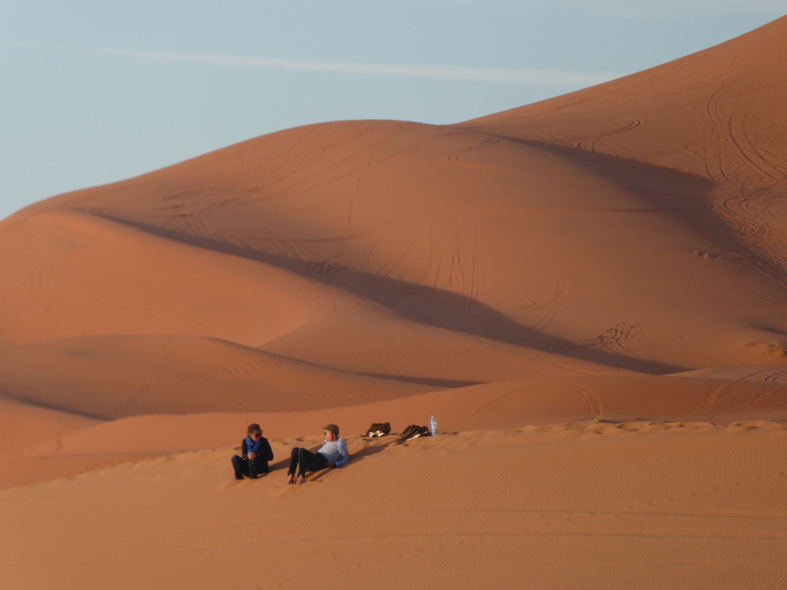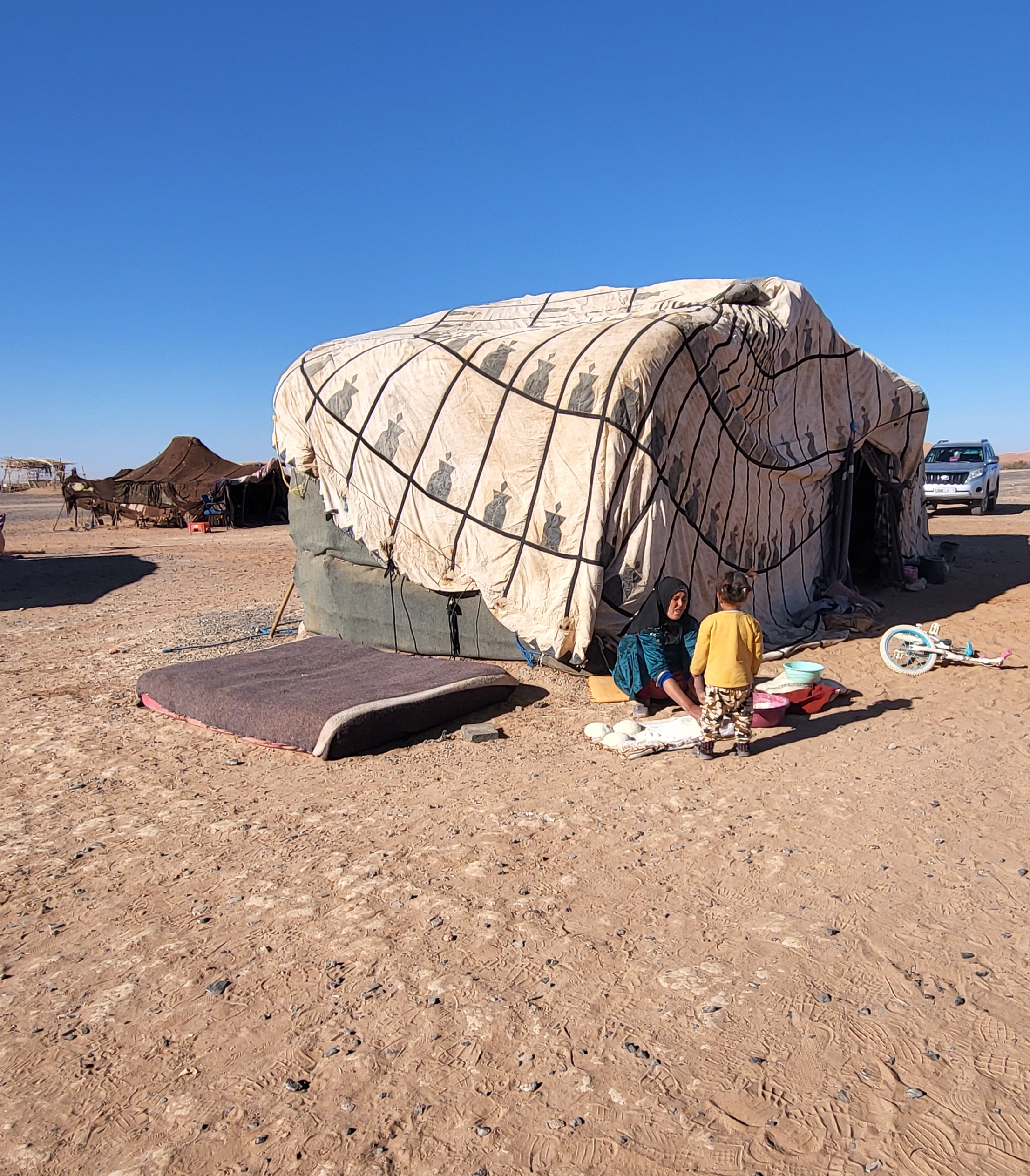 In general, Berber people are more concentrated in the southern part of the country, that is, close to or within the desert. They have been nomadic peoples for millennia, given the name Berber by the Romans to identify them as Barbarians. During our brief time in the Sahara, we visited an encampment of Berber families who were remaining there for the year, though usually they would only stay for the winter months. They keep cattle and possibly other animals at a wooded area nearby that they care for. They did not go back deep into the Sahara last year either because of drought. In past times, they could settle in places deeper in the desert and have an ample supply of water for their cattle and themselves.