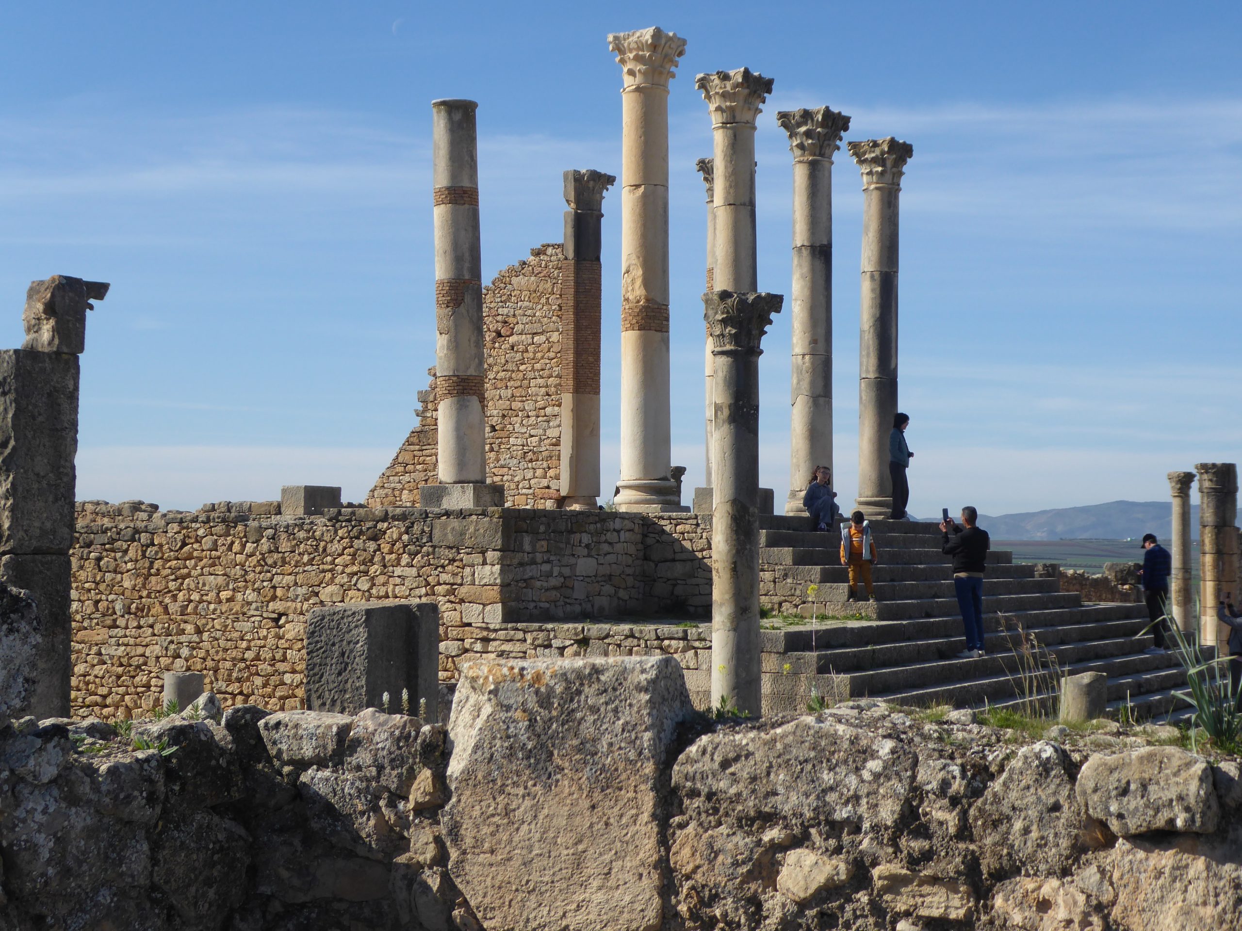 Early the next morning we boarded our van and were off to Fez, stopping for a walk about the extensive Roman ruins at Volubilis, one of several UNESCO sites that we visited. Founded in the 3rd century BC, the ruins cover a vast area of rolling hills and farmland. People lived in the city until about the 17th century – Berbers, Syrians, Jews and others, speaking Latin as a common language. Earthquakes then destroyed much of the superstructure. To date only about a third of the area has been excavated. Nonetheless, the marble pillars and mosaic floors of the baths do not fail to impress.