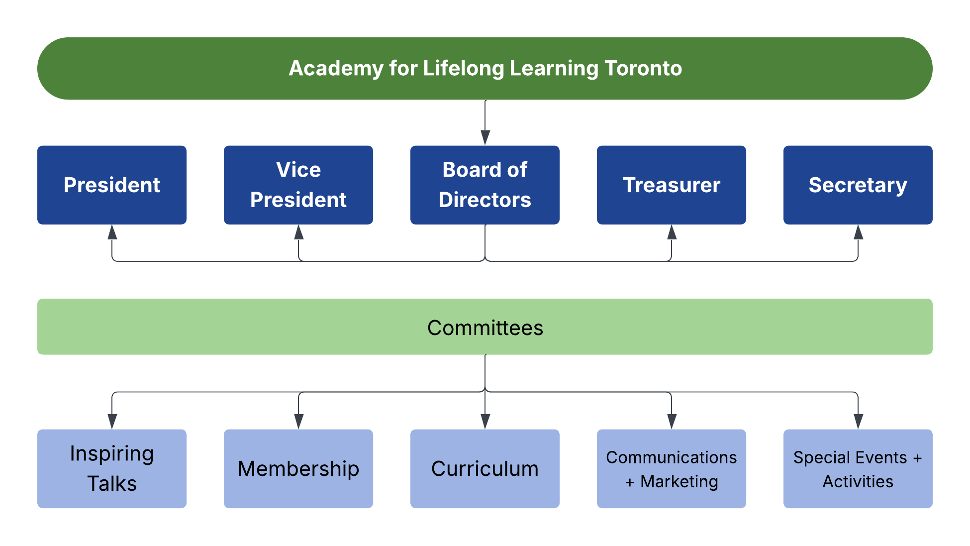 The following chart illustrates how the Academy works. The Board and Committee structure is designed to support the Workshops, the Walks, the Talks – all our various programs. Have a look at the tasks of each of the committees. You may find a place to share your skills and interests.